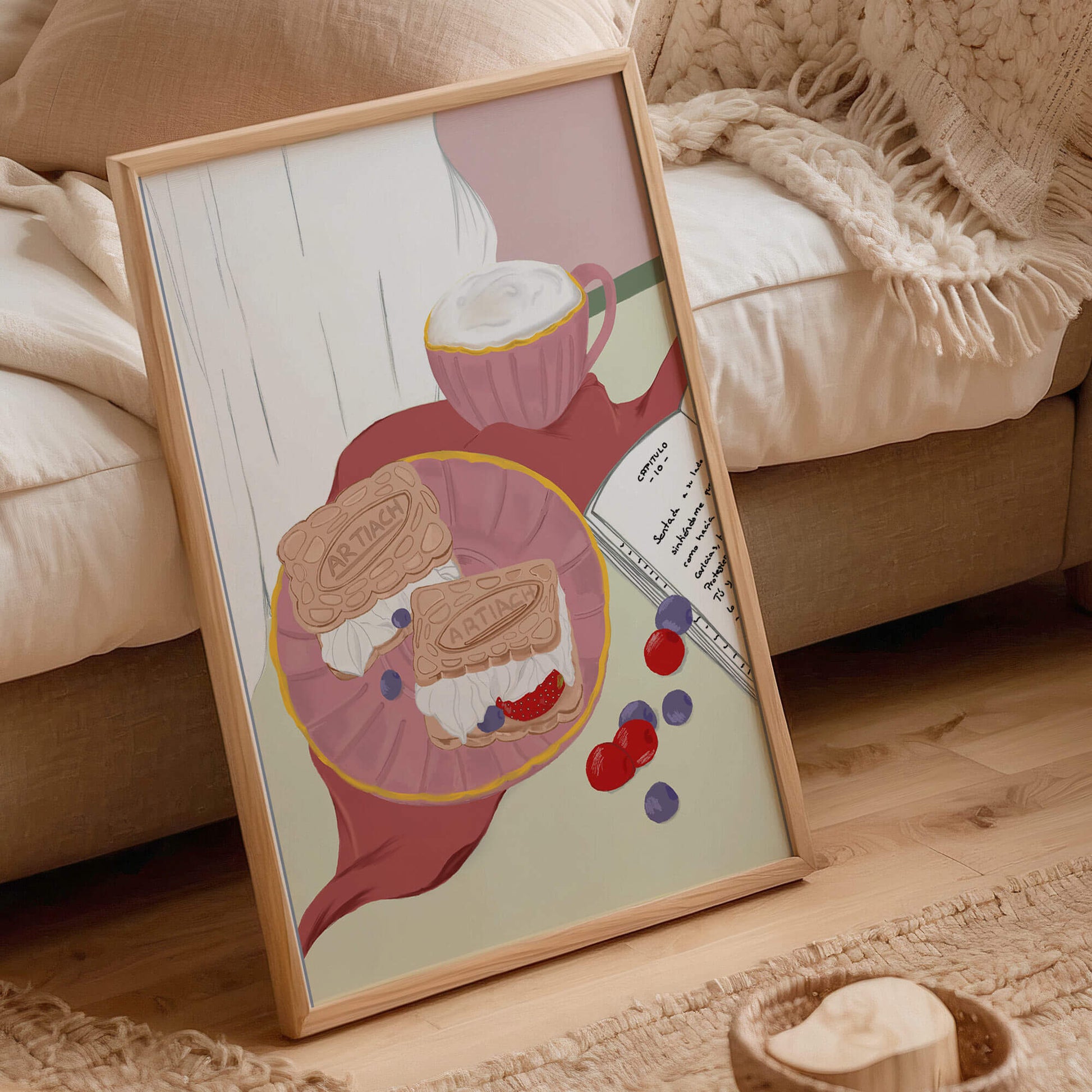 Hol dir ein Stück Kindheitserinnerung nach Hause! Dieses hochwertige Canvas Print im DIN A4-Format zeigt eine stimmungsvolle Szene: Eine warme Tasse Kaffee, ein offenes Buch und die Kekse, die du noch von Oma kennst – die besonderen, cremegefüllten Leckereien, die sie immer für besondere Anlässe aufgehoben hat.