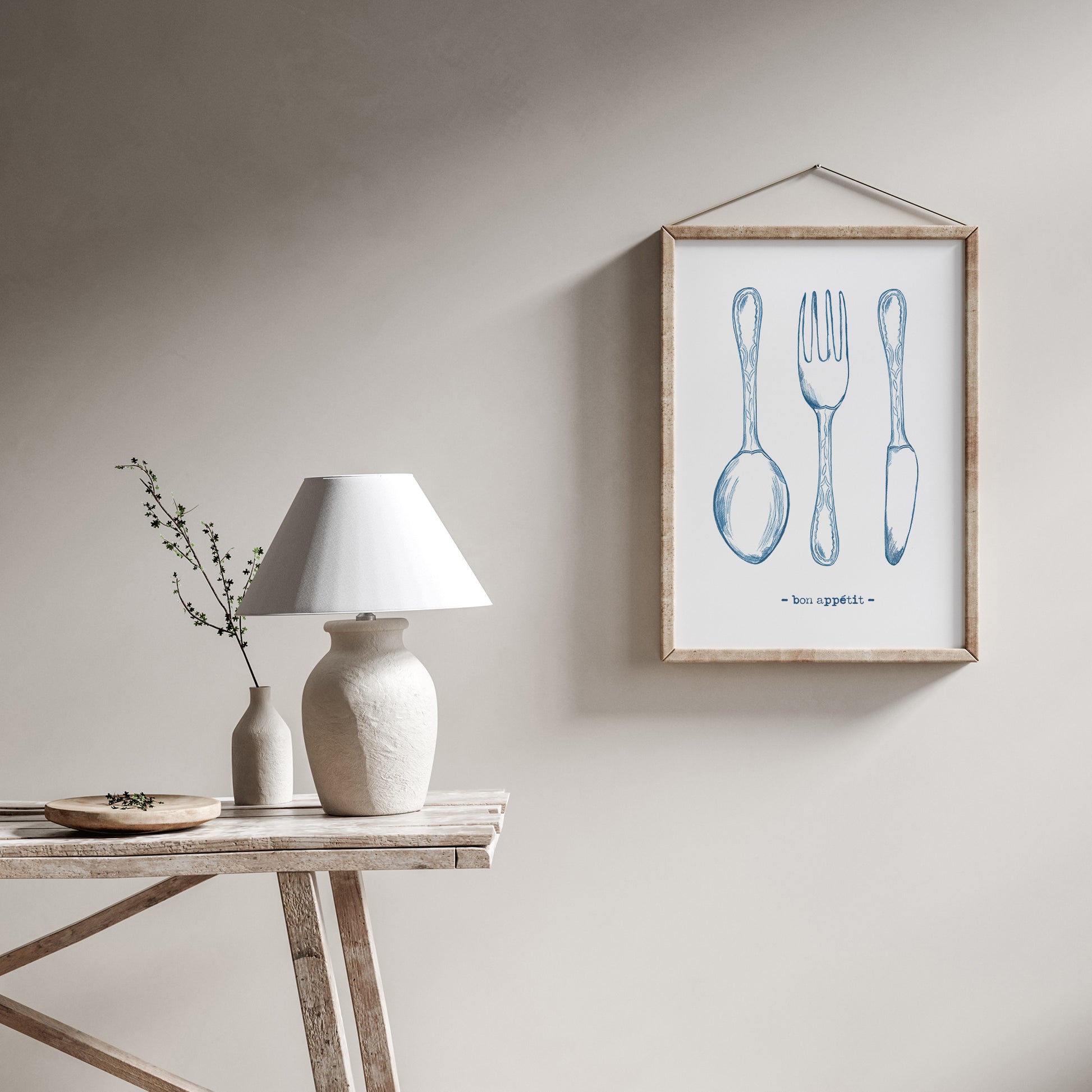 Setze stilvolle Akzente in deiner Küche oder deinem Essbereich mit diesem einzigartigen Print im DIN A4-Format. Das minimalistische Design zeigt eine kunstvolle Skizze von Gabel, Messer und Löffel in harmonischen Blautönen, ergänzt durch die elegante Aufschrift „Bon Appétit“ in klarer Druckschrift.