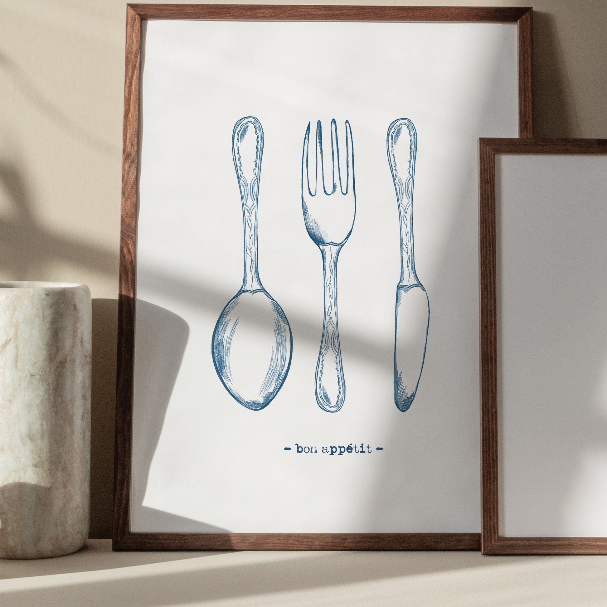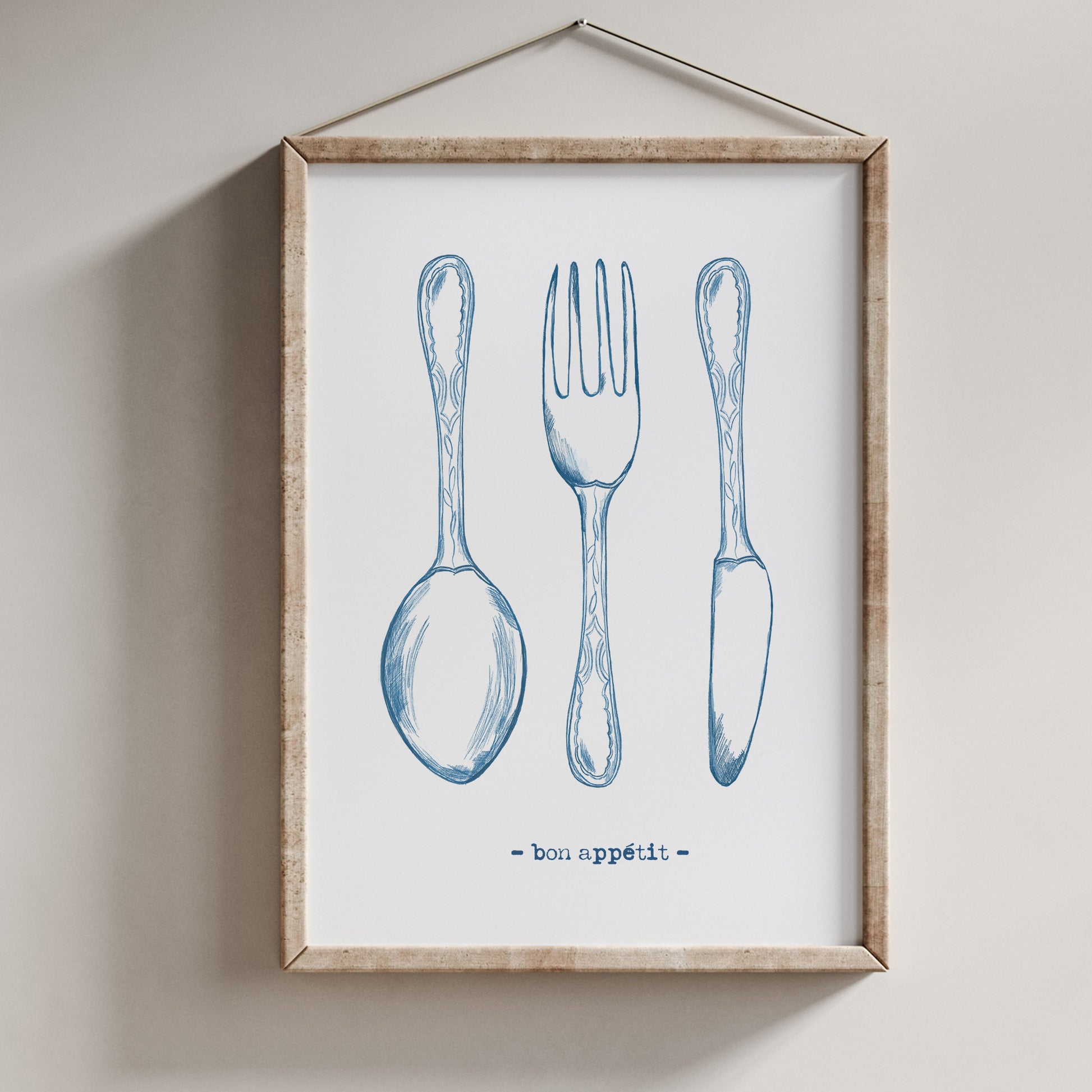 Print DIN A4: Elegante Besteck-Skizze im modernen Blau – „Bon Appétit“
