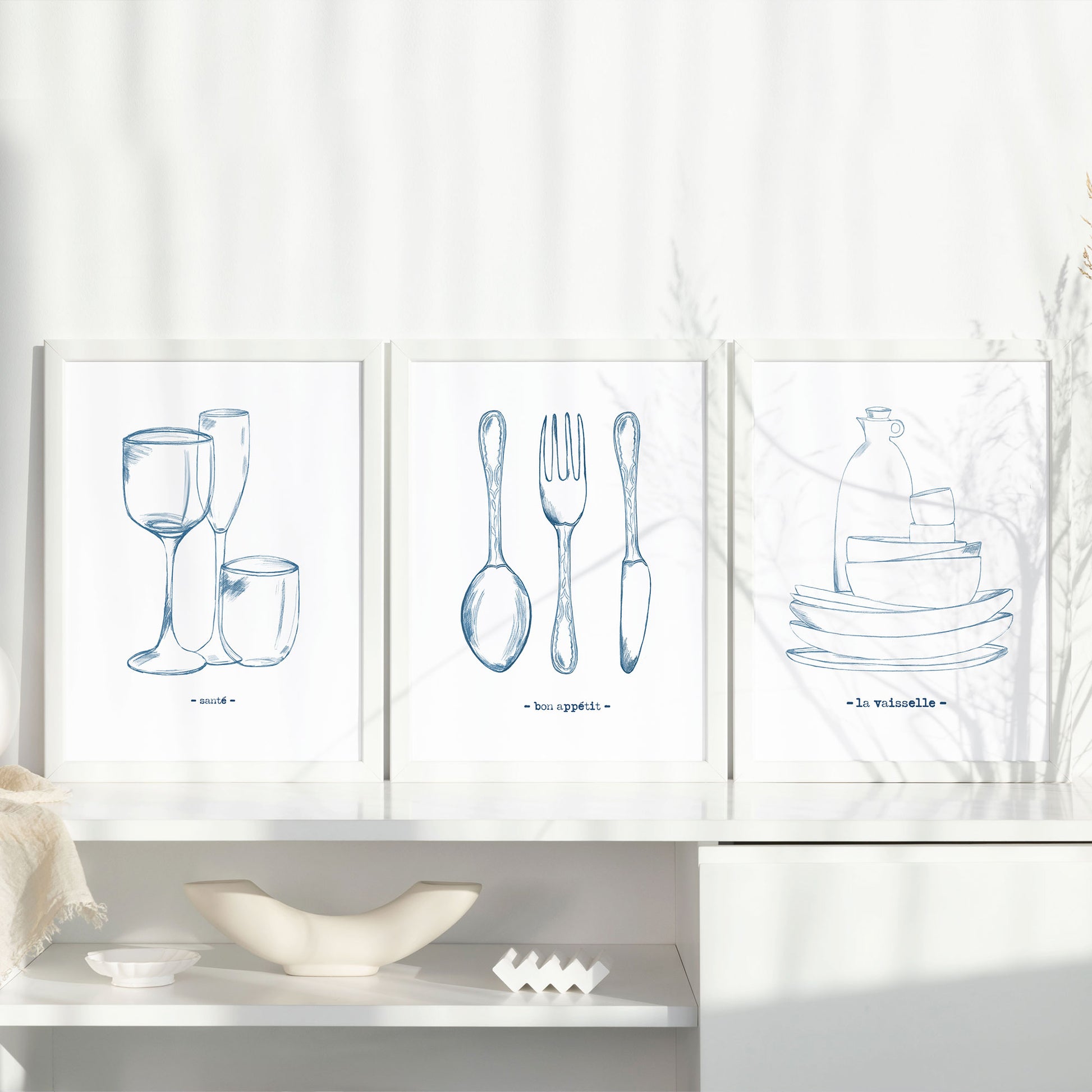 Bringe eleganten Charme in dein Zuhause mit diesem modernen Print im DIN A4-Format. Das minimalistische Kunstwerk zeigt drei kunstvoll gezeichnete Gläser in unterschiedlichen Formen – ideal für Wein, Champage oder Wasser – in einem stilvollen Blau. Unter dem Motiv verleiht die Aufschrift „Santé“ in klarer Druckschrift eine feine, französische Note.