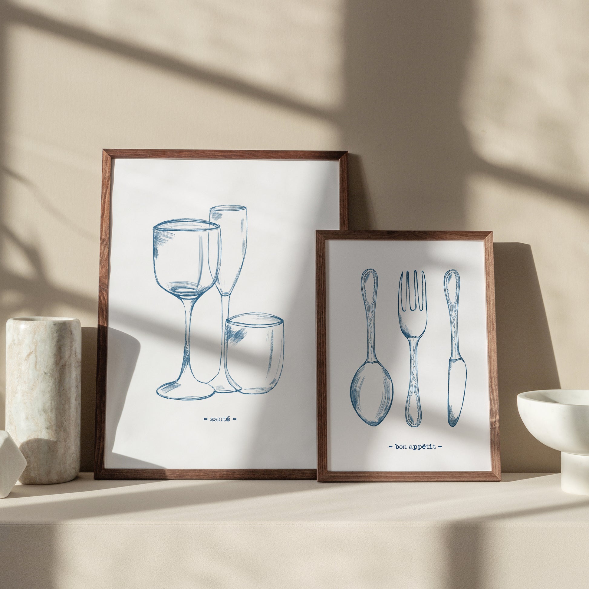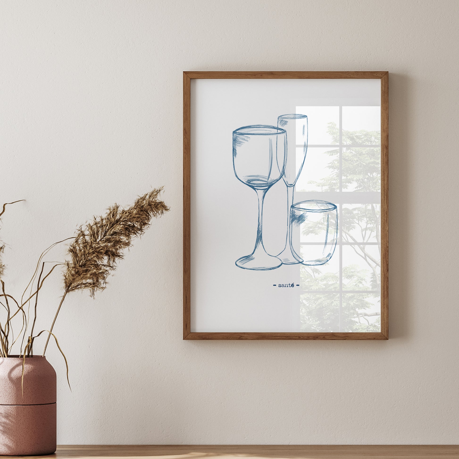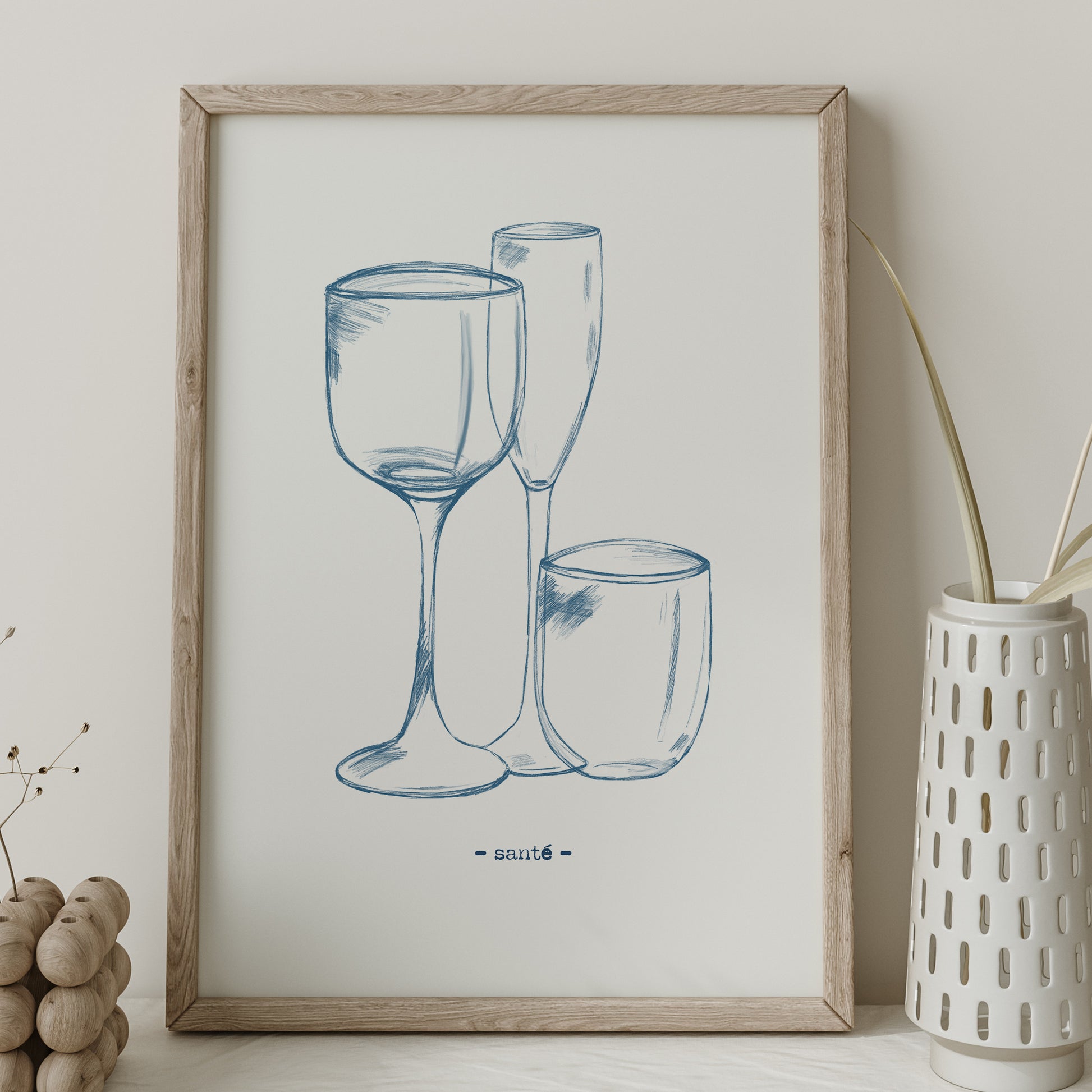 Print DIN A4: Stilvolle Gläser-Skizze in Blau – „Santé“
