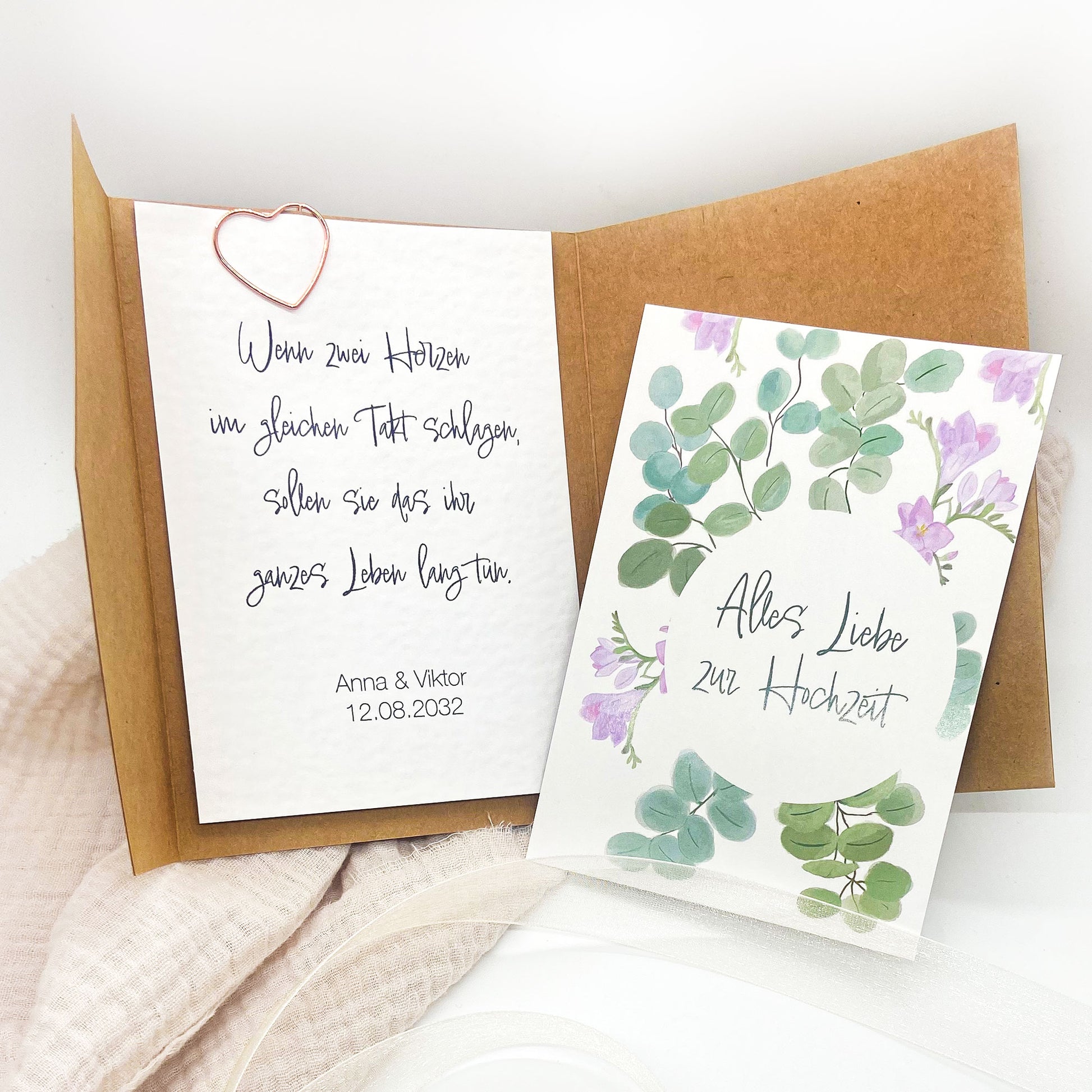 Die Hochzeitskarte besteht aus einer Kraftpapier-Pocketfoldkarte, einem personalisierten Einleger mit der Aufschrift "Wenn zwei Herzen im gleichen Takt schlagen, sollen sie das ihr ganzes Leben lang tun." sowie den Vornamen und dem Hochzeitsdatum des Ehepaares.