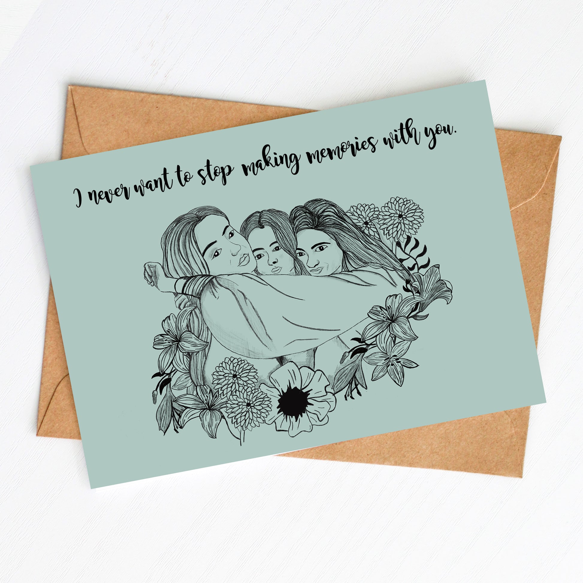 Versenden Sie Freude und Herzlichkeit mit unserer liebevoll gestalteten Postkarte! Die Illustration zeigt drei Freundinnen, die sich innig umarmen begleitet von der gefühlvollen Botschaft: „I never want to stop making memories with you.“ symbolisiert die unzerbrechliche Kraft der Freundschaft und Zuneigung.