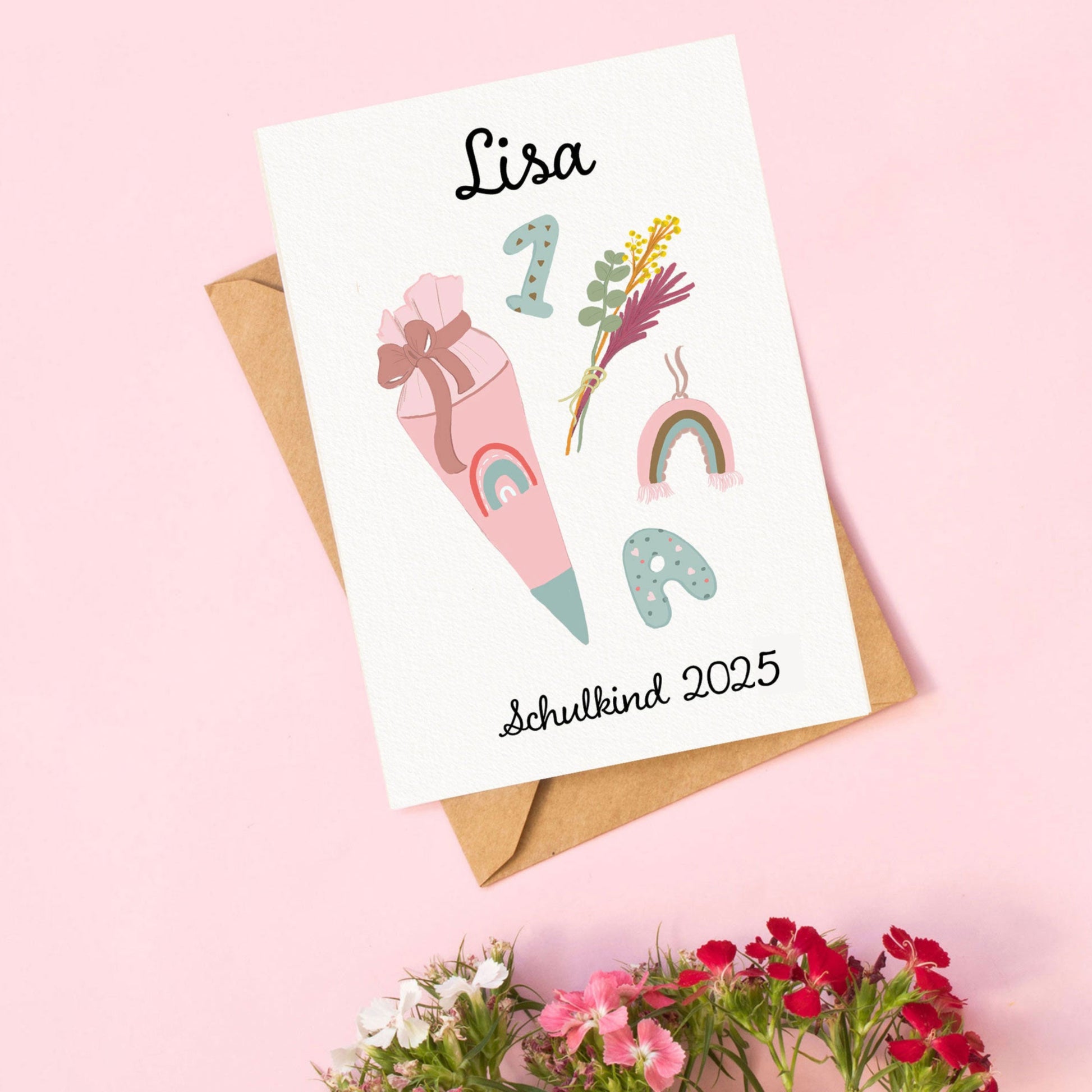 Karte zur Einschulung für Mädchen mit Name | 1. Schultag Karte mit Umschlag