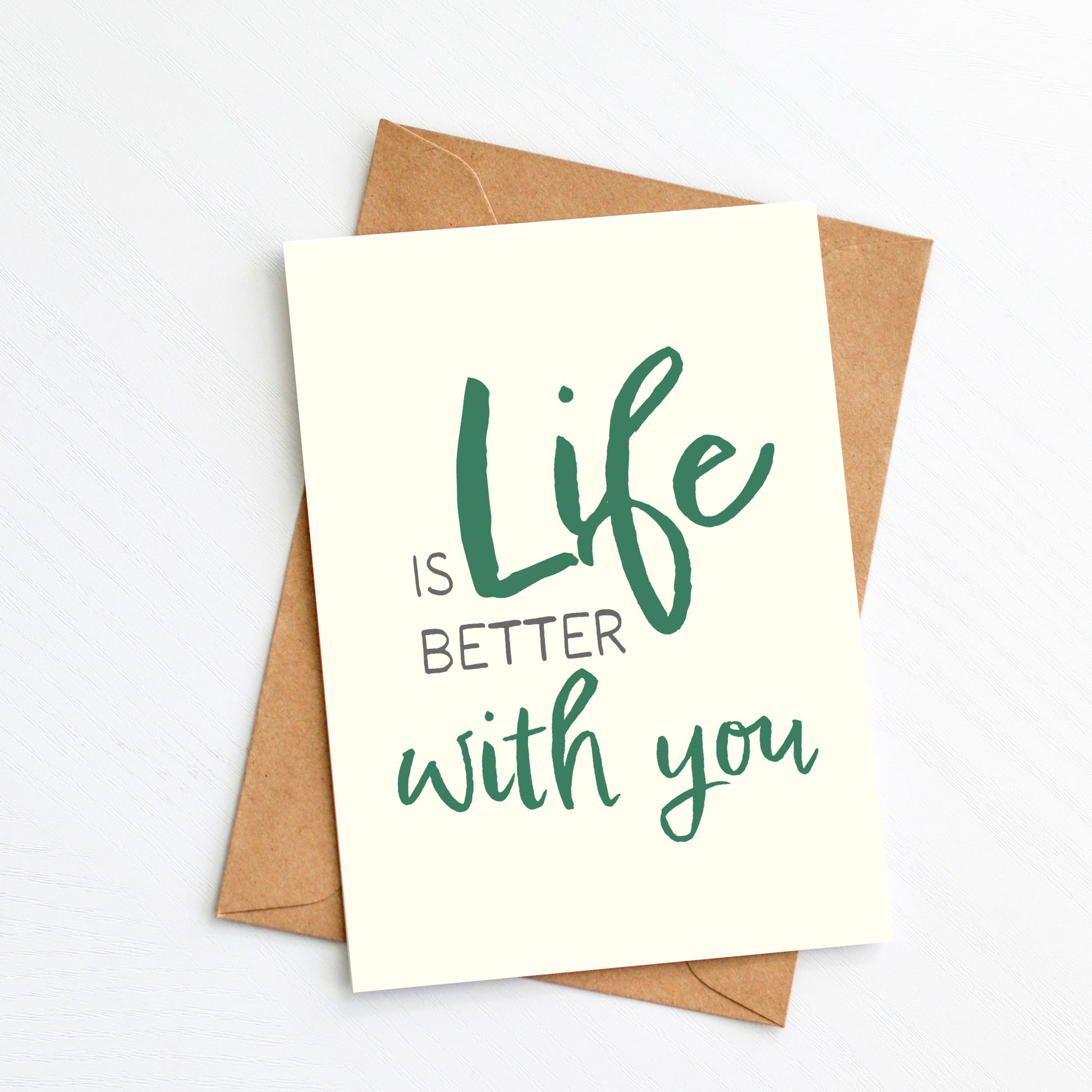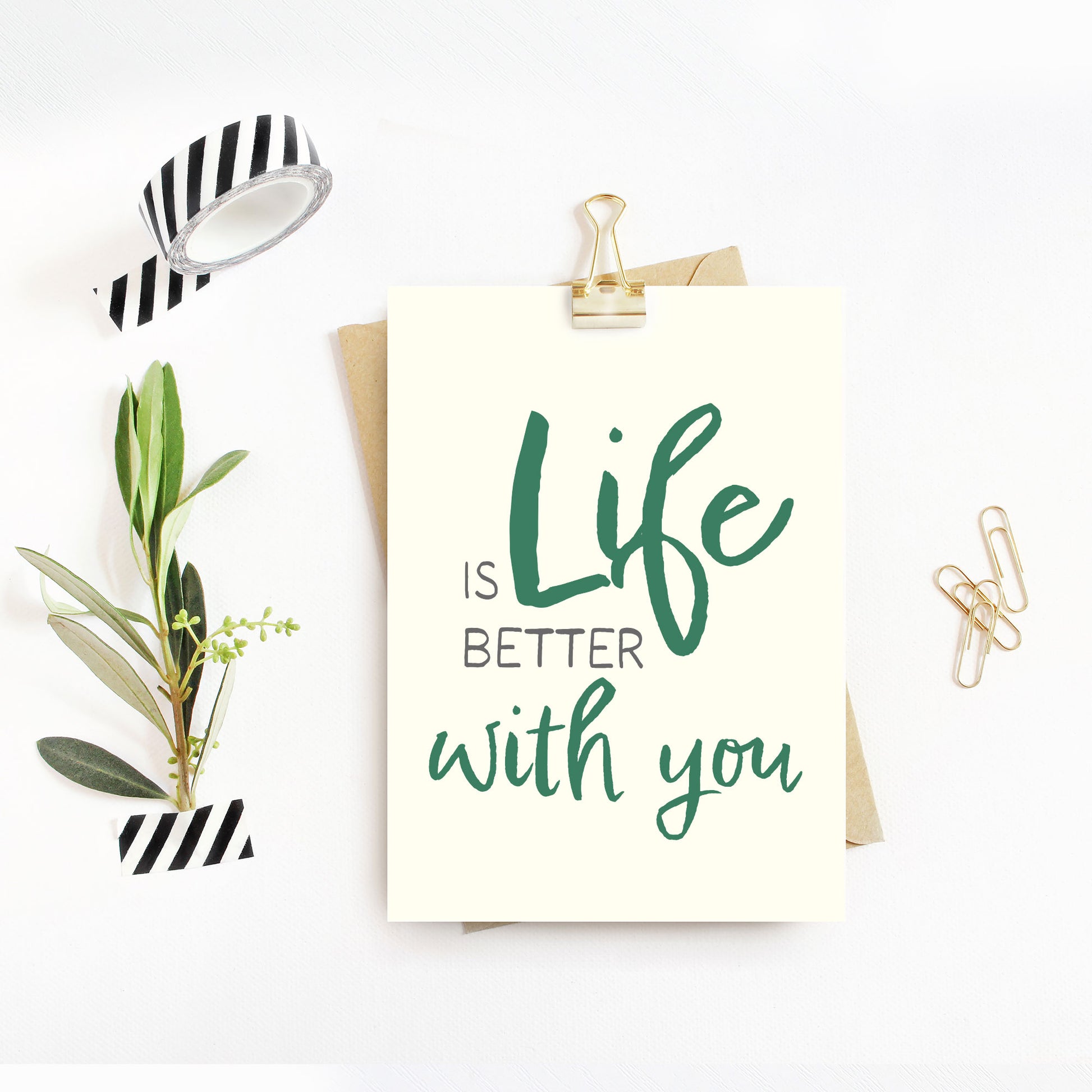 Die perfekte Karte für eine Liebeserklärung: Unsere hochwertige Liebeskarte im Din A6 Format mit der Aufschrift "Life is better with you" zeigt deinem Schatz, wie sehr du ihn oder sie liebst. Die Karte ist auf edlem Papier gedruckt und verfügt über eine schöne Optik, die jeden Empfänger beeindrucken wird. Ob als romantische Überraschung oder als liebevoller Gruß, diese Karte ist eine wunderbare Möglichkeit, deine Gefühle auszudrücken. Kaufe jetzt unsere exklusive Valentinstagskarte und mache deinen Liebsten eine Freude.