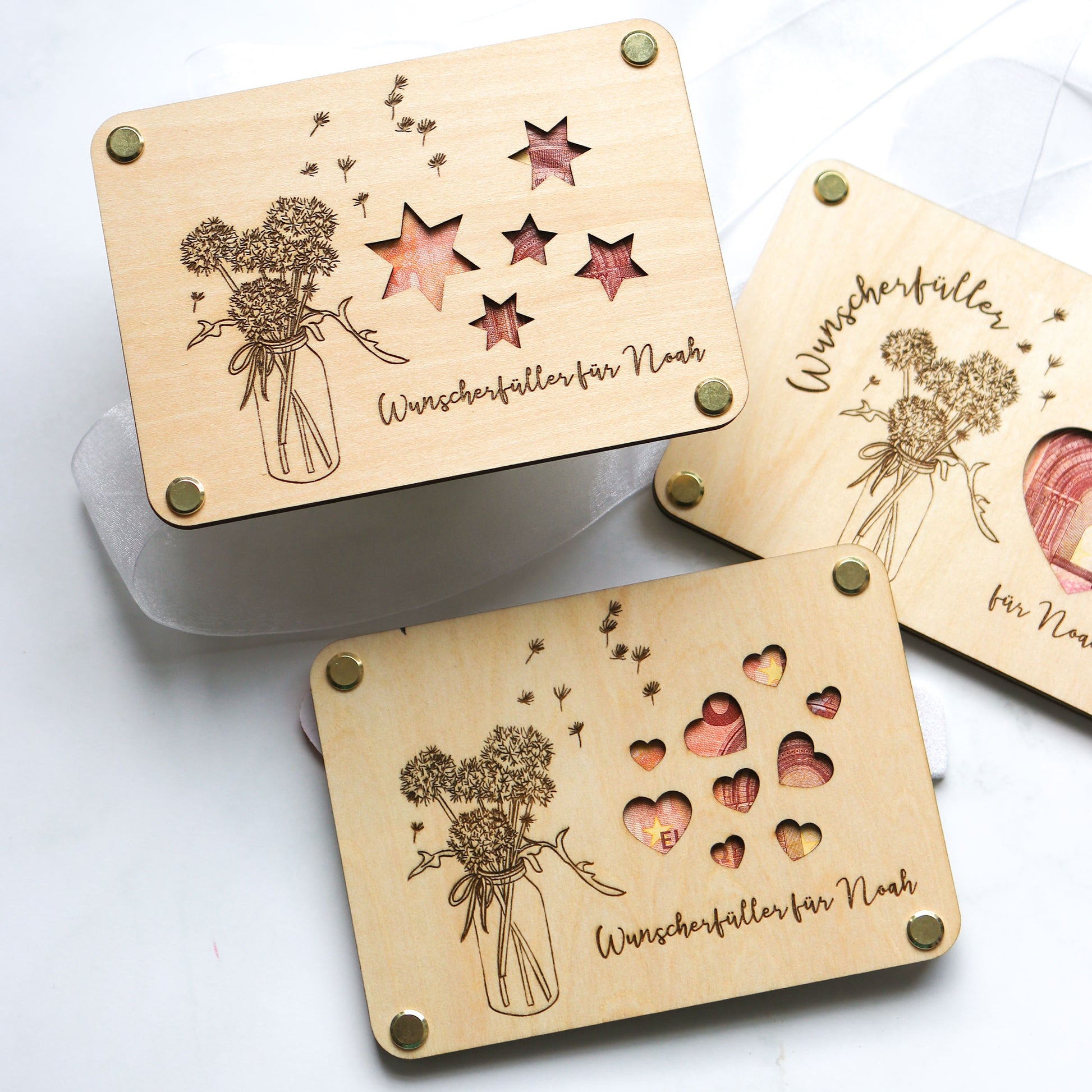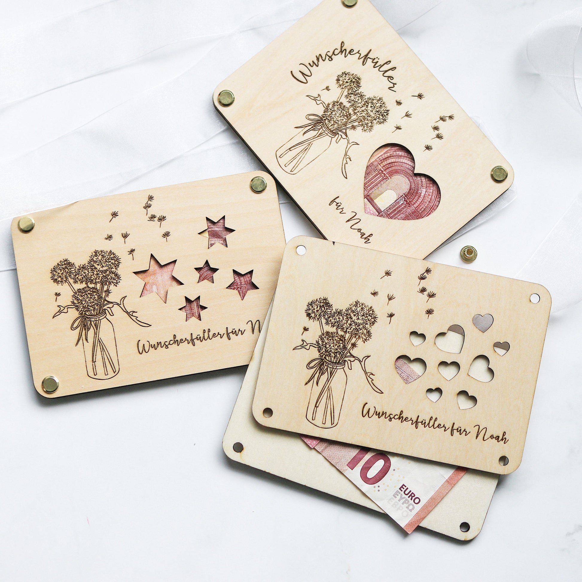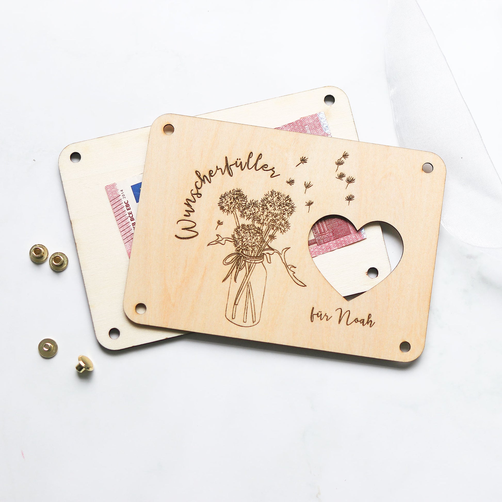 Du suchst ein besonderes Geldgeschenk, das sowohl elegant als auch persönlich ist? Unser Wunscherfüller zu vielen Anlässen ist die perfekte Kombination aus stilvoller Geschenkverpackung für Geld und liebevoll gestalteter Karte aus Holz – ein echtes Highlight für Hochzeit, Abitur, Taufe, Kommunion oder Geburtstag und eine tolle Alternative zu einer Geschenkschachtel oder Geschenkbox.