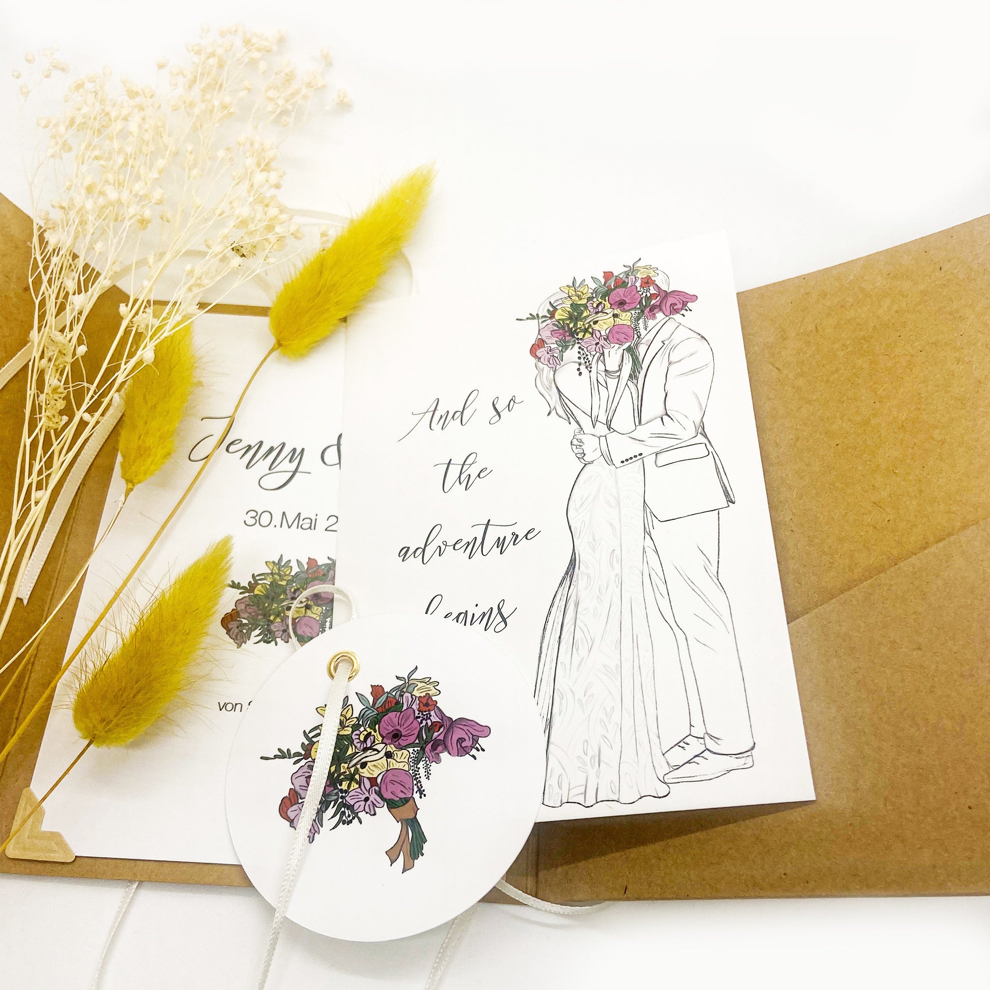 Bestehend aus einer Kraftpapier-Pocketfoldkarte, einer Karte mit dem Namen des Brautpaars, dem Hochzeitsdatum und Namen der Schenkenden sowie der oben genannten Karte.