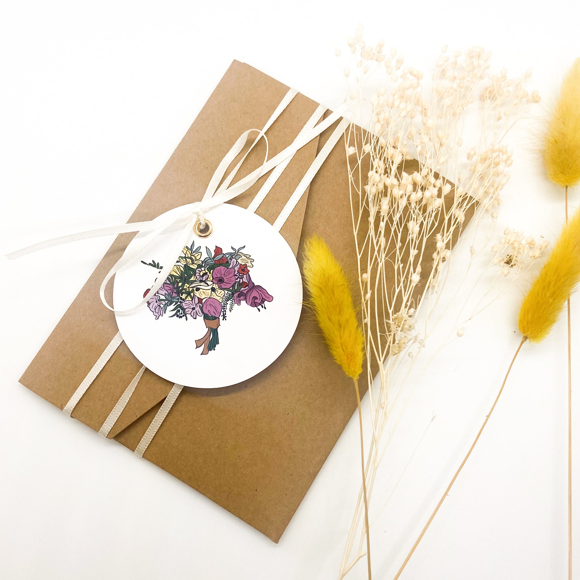 Verschlossen wird die Karte mit einem runden Hochzeitsstrauß-Anhänger.