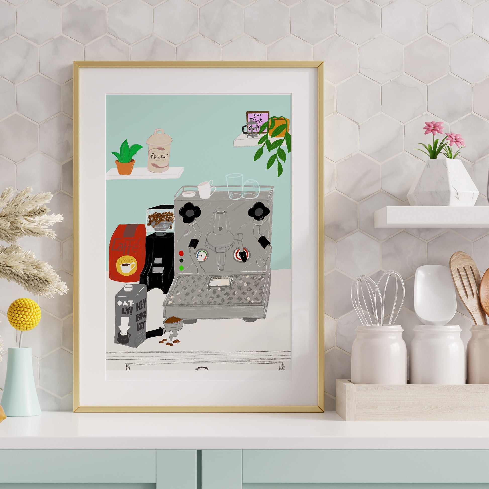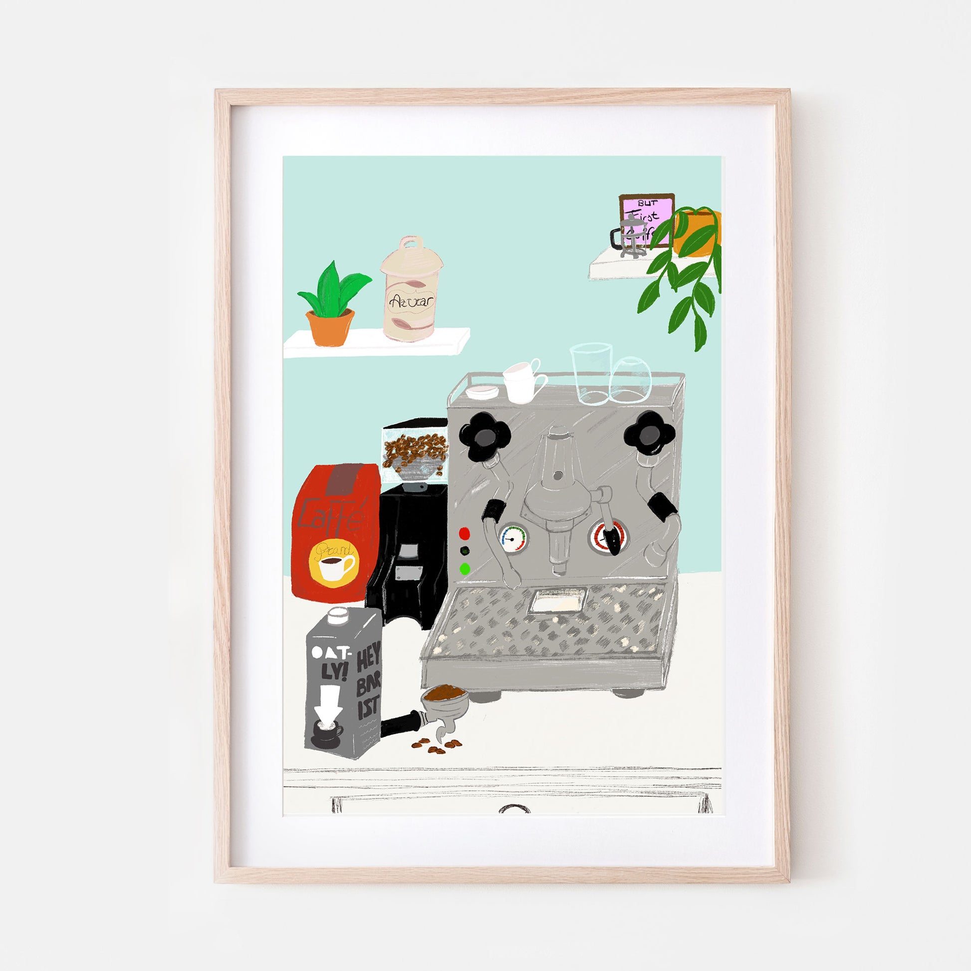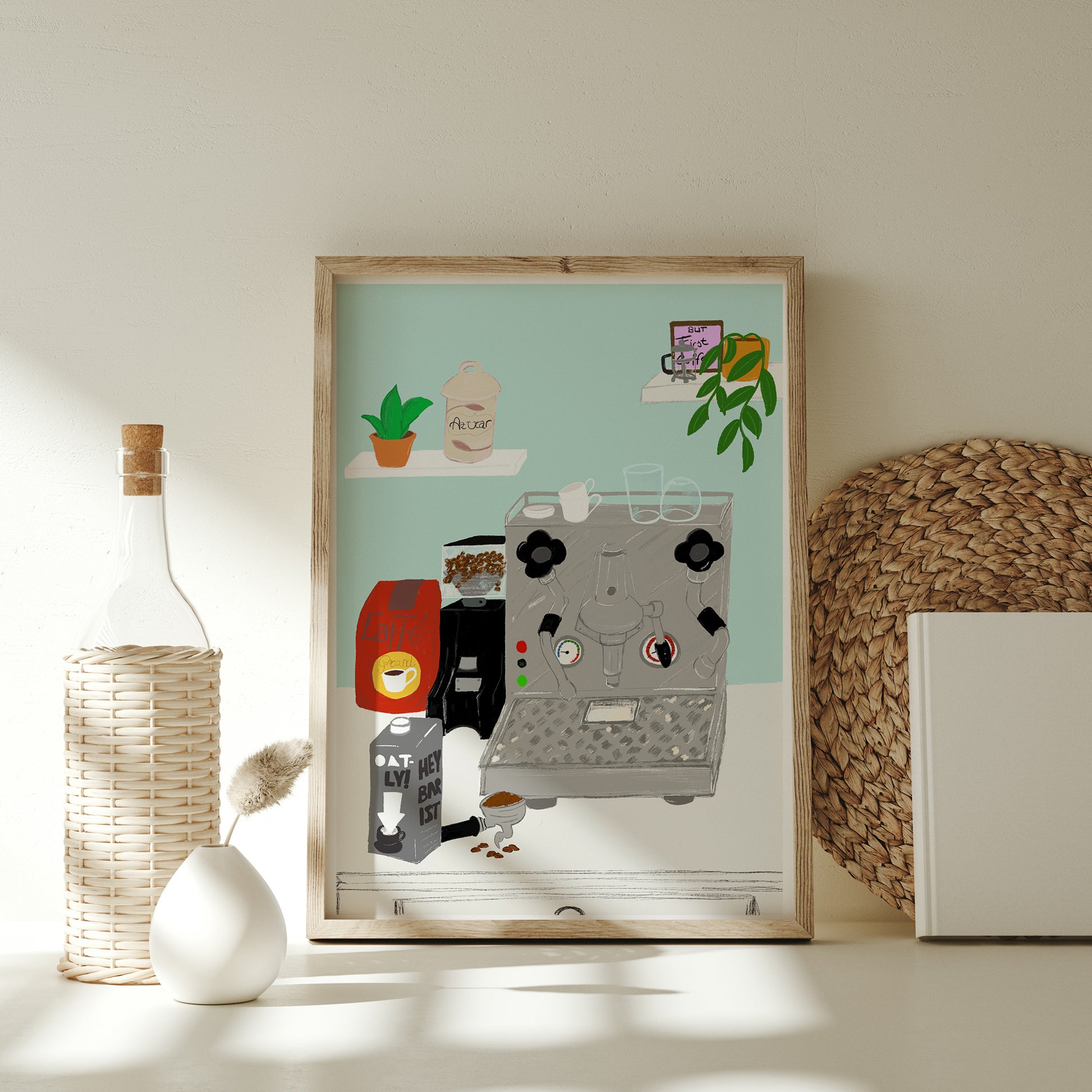 Es ist selbstgemalt und digitalisiert. Es zeigt meine geliebte Siebträgermaschine nebst Kaffee-Mühle.