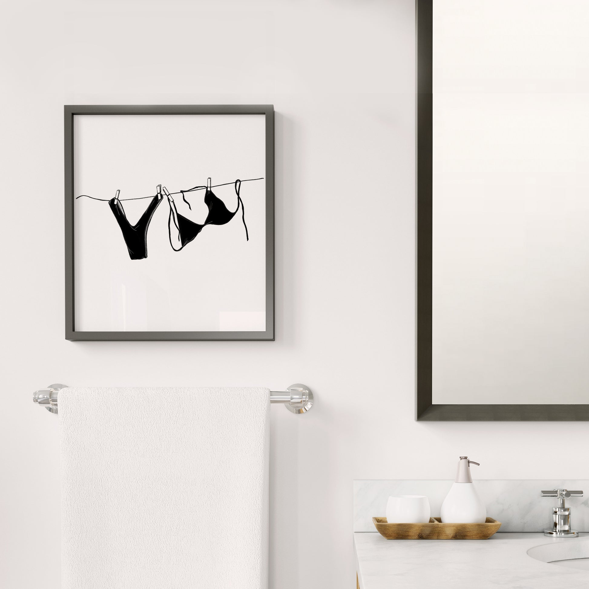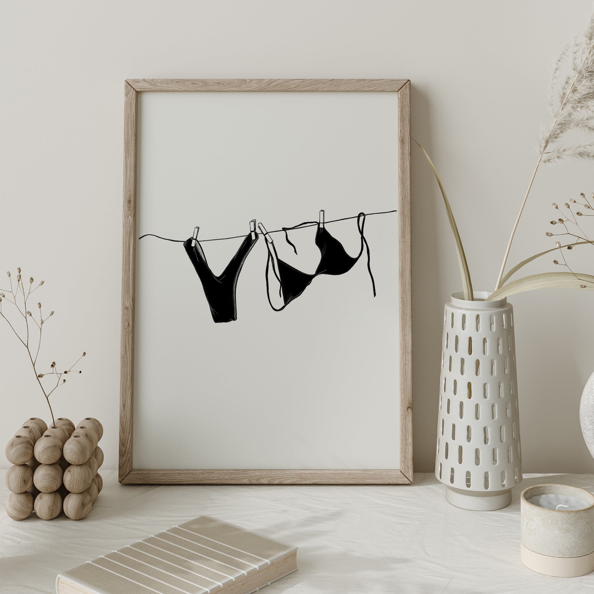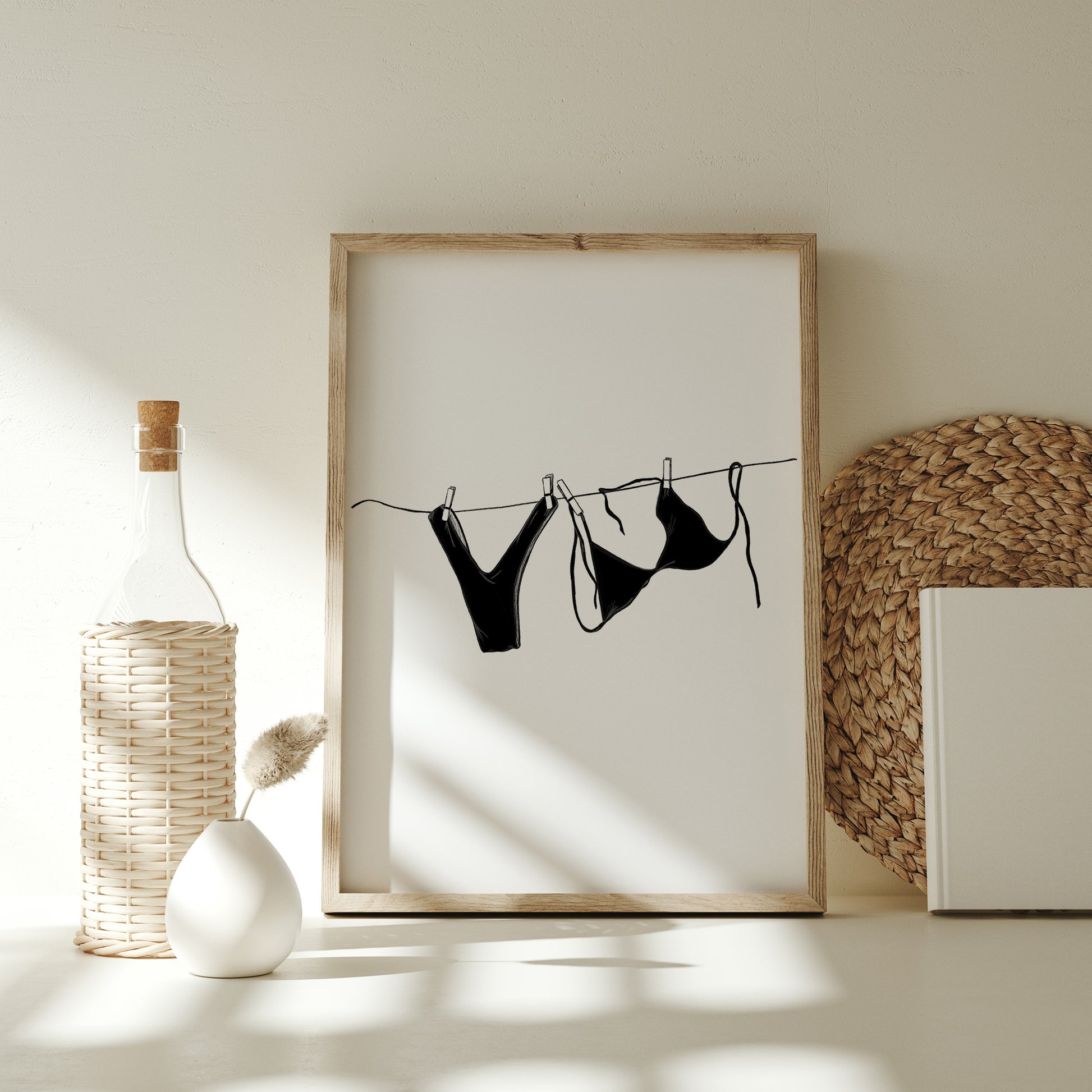 Schwarz-Weiß Illustration Print: Bikini an der Wäscheleine – Stilvolle Wanddekoration