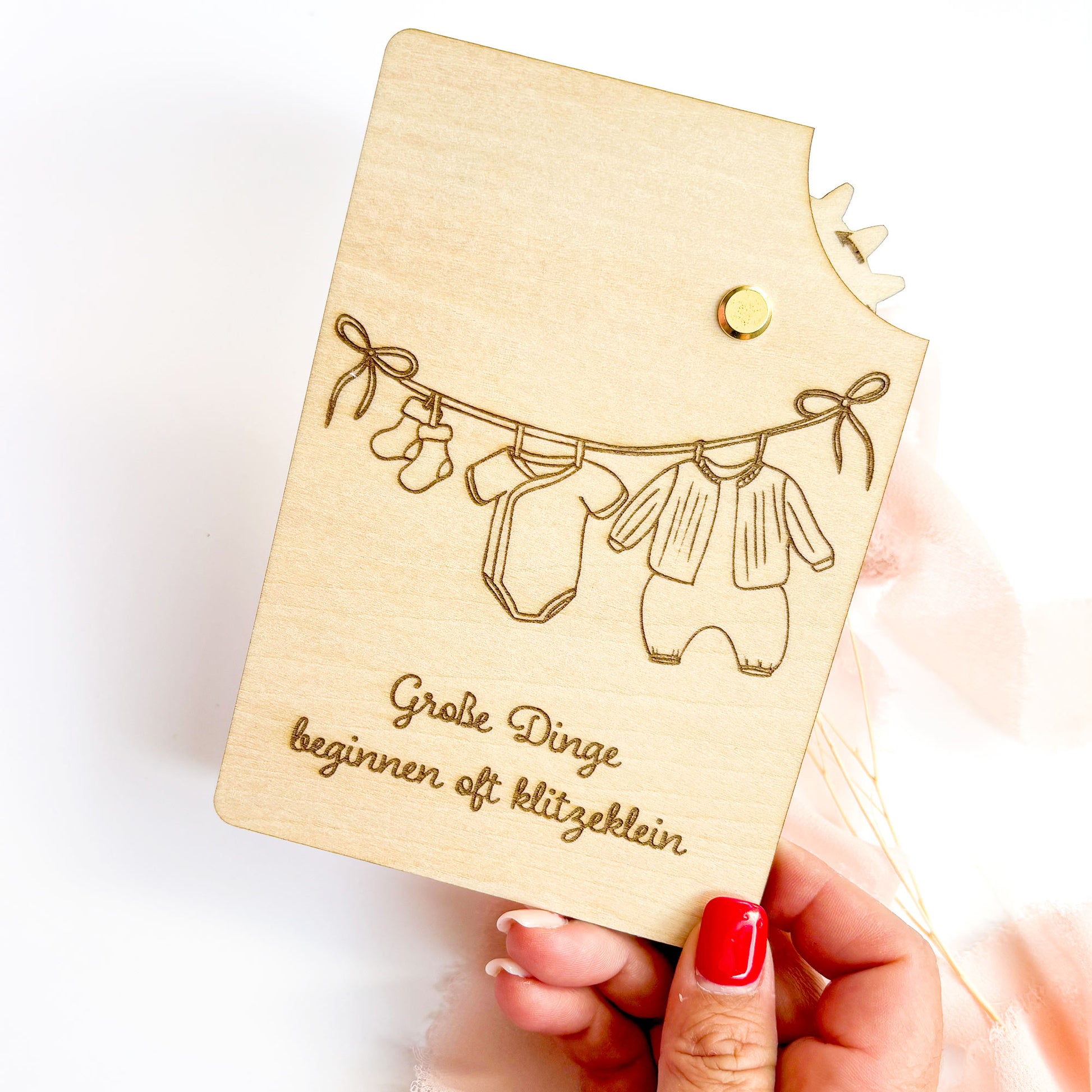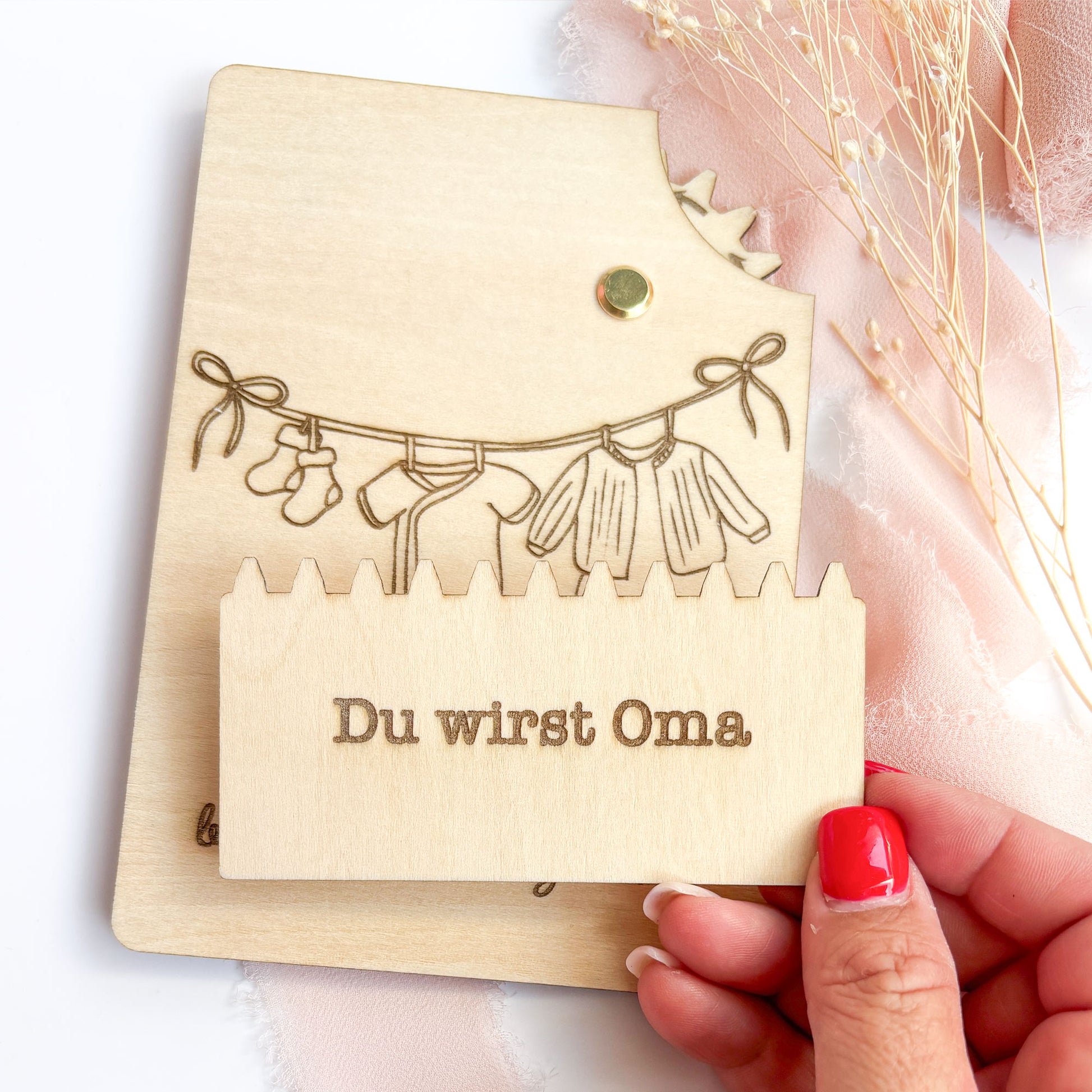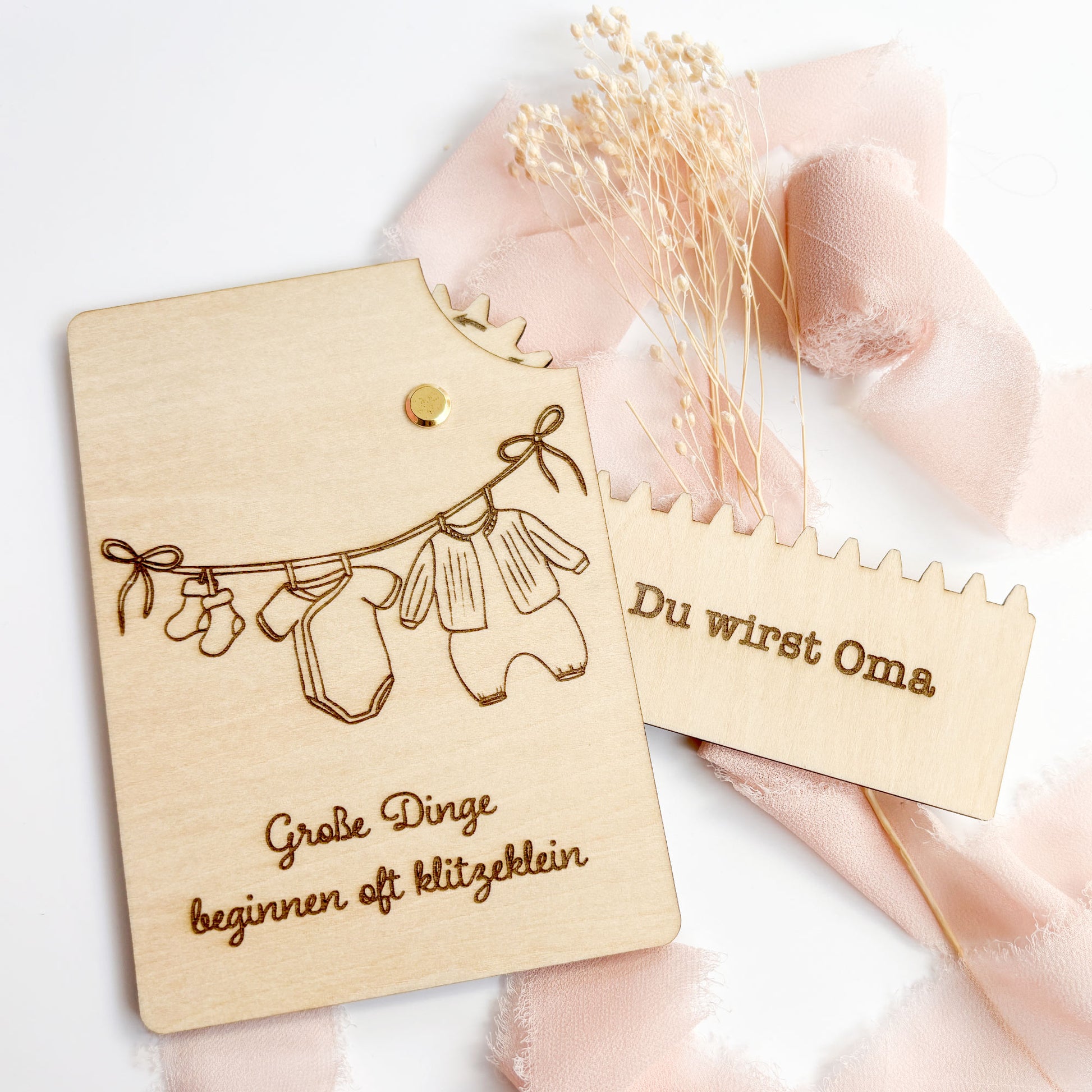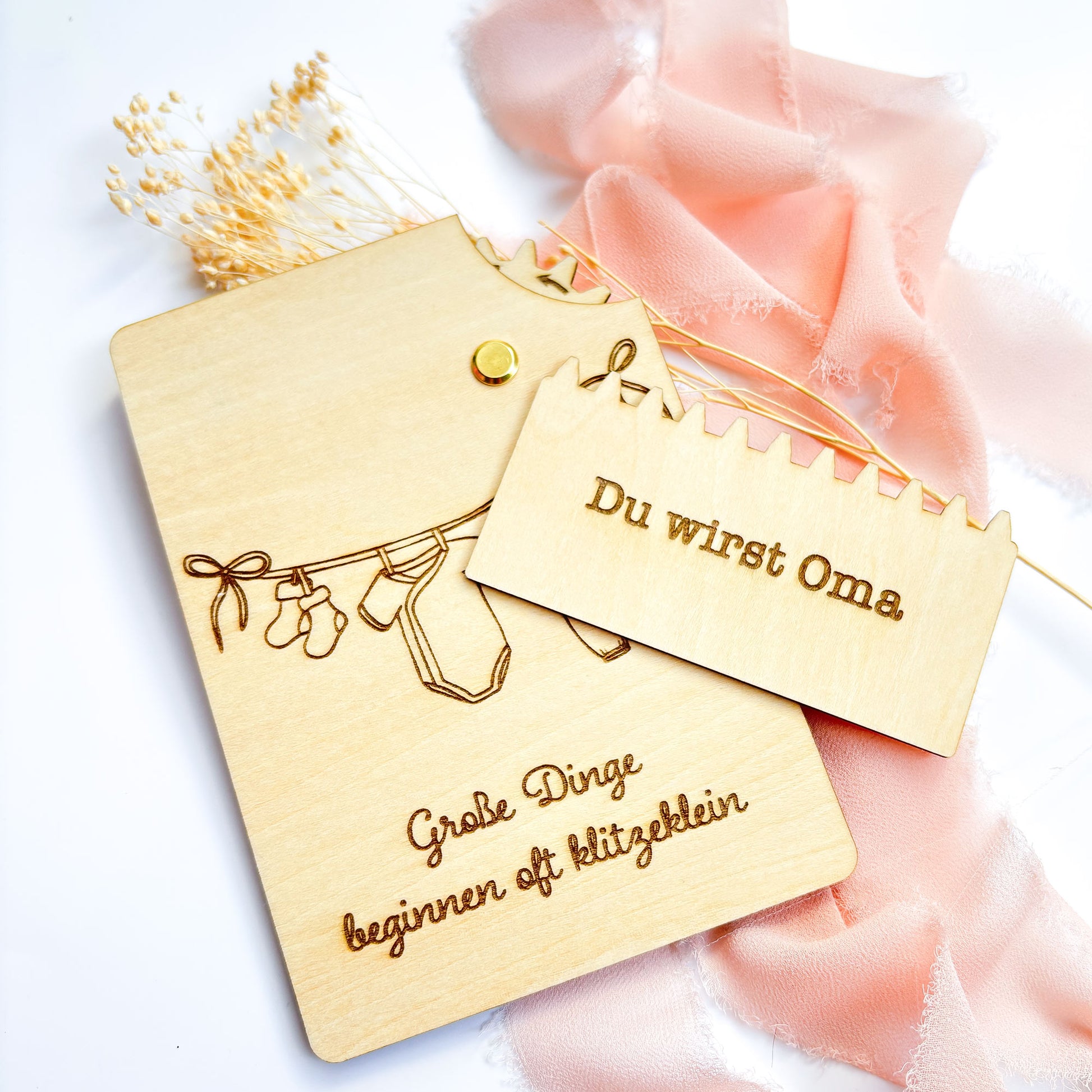 Entdecke eine völlig neue Art, besondere Momente zu verkünden: Unsere handgefertigte Holzkarte mit Geheimmechanismus ist nicht nur eine stilvolle Karte, sondern auch ein echtes Erlebnis. Im Format **DIN A6** und mit **abgerundeten Ecken** ist sie perfekt geeignet, um eine herzerwärmende Botschaft stilvoll zu überbringen – die freudige Nachricht: "Du wirst Oma"! Auf der Vorderseite befindet sich die Aufschrift: "Große Dinge beginnen oft klitzeklein" und ein Babybody, Strampler und Socken, die auf einer Wäscheleine hängen.