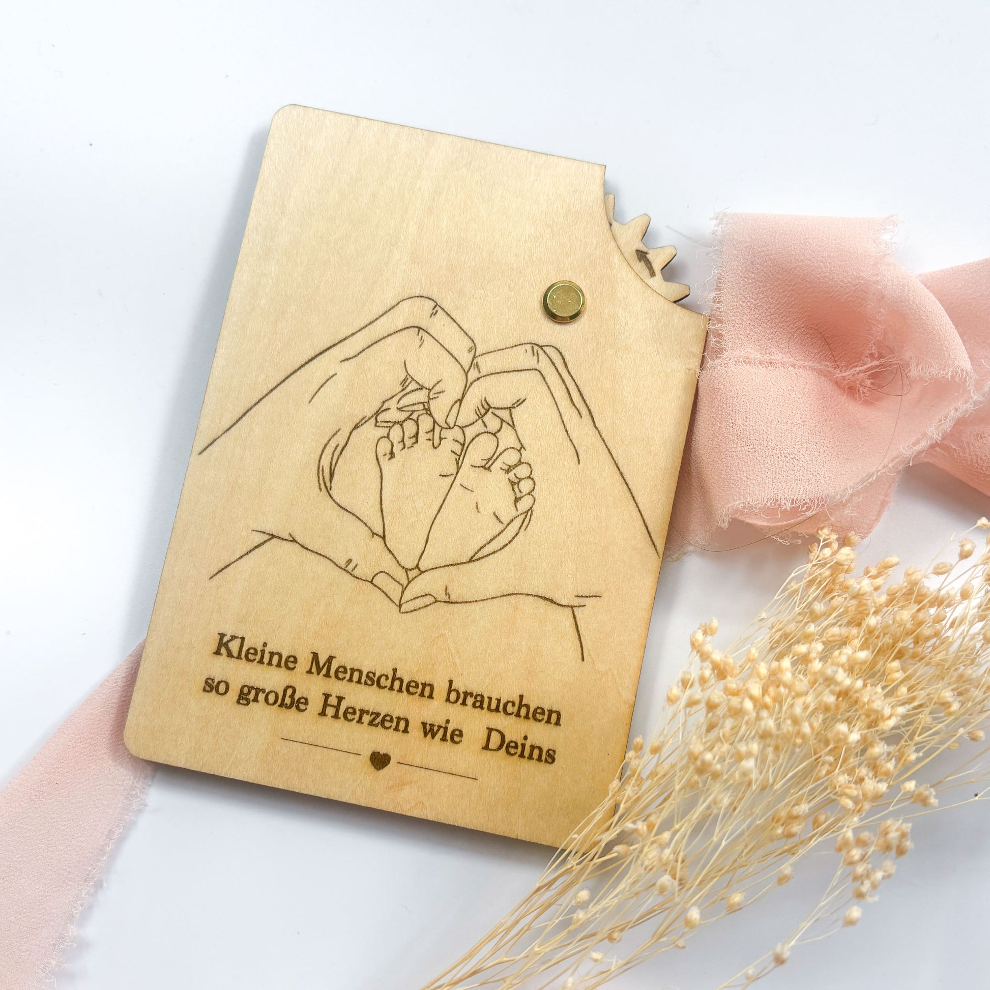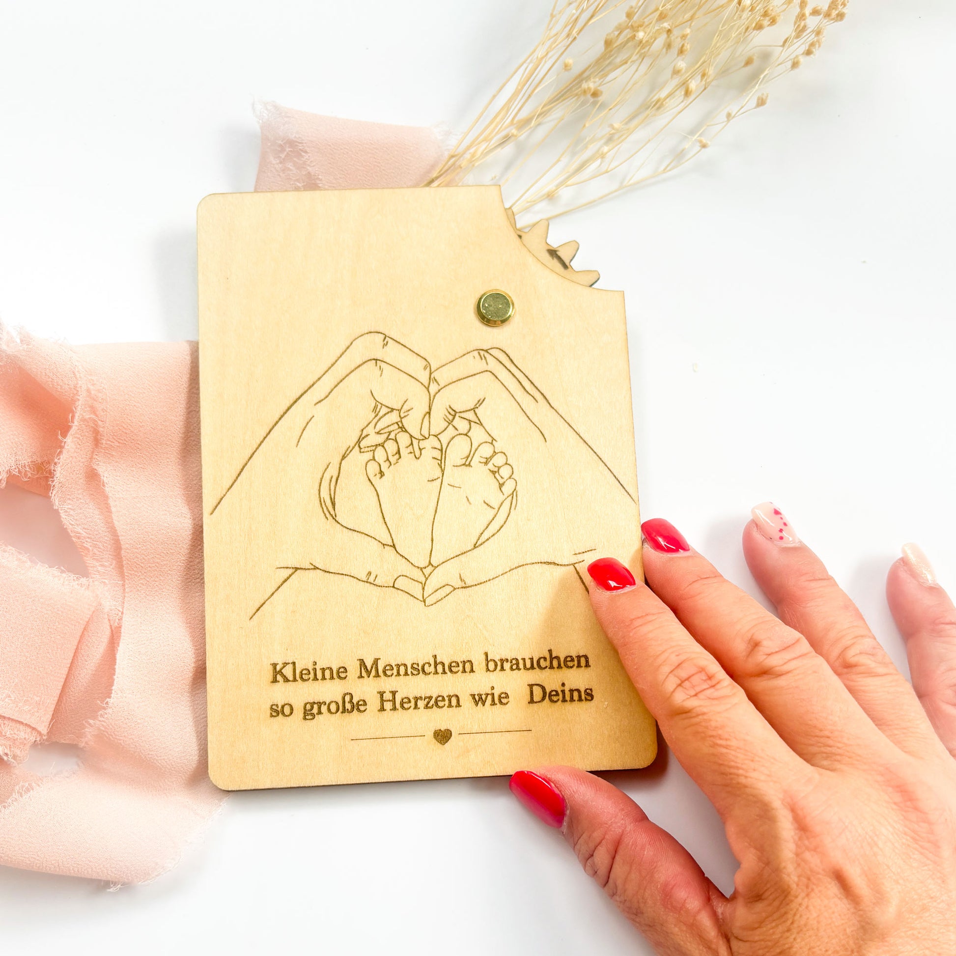 Auf der Vorderseite der Karte sind eine große und eine kleine **Kinderhand graviert**, die sich symbolisch festhalten – ein Bild voller Vertrauen und Zuneigung. Ergänzt wird das Motiv durch den gravierten Spruch: